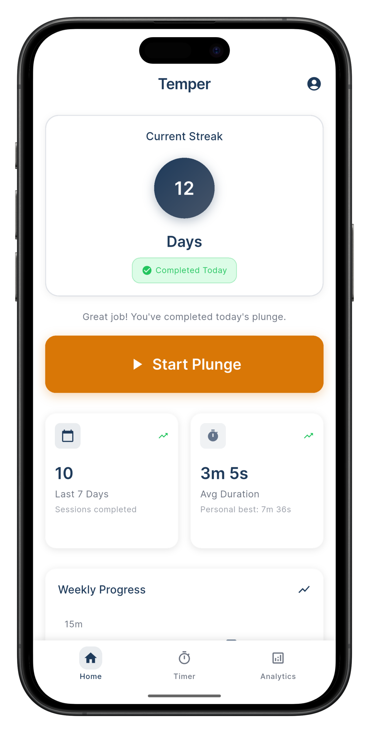Temper tracks every plunge, builds your streak, and shows you exactly how far you've come. And the further you get, the harder it is to walk away.